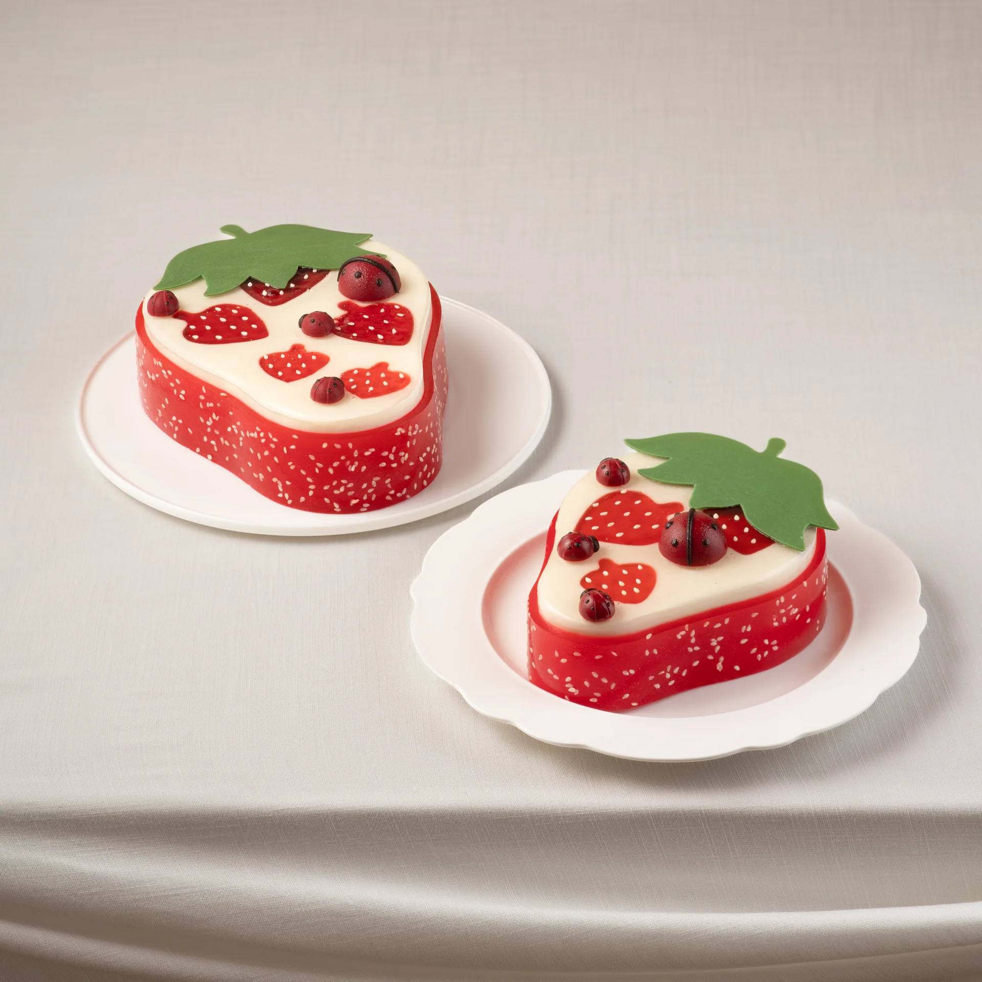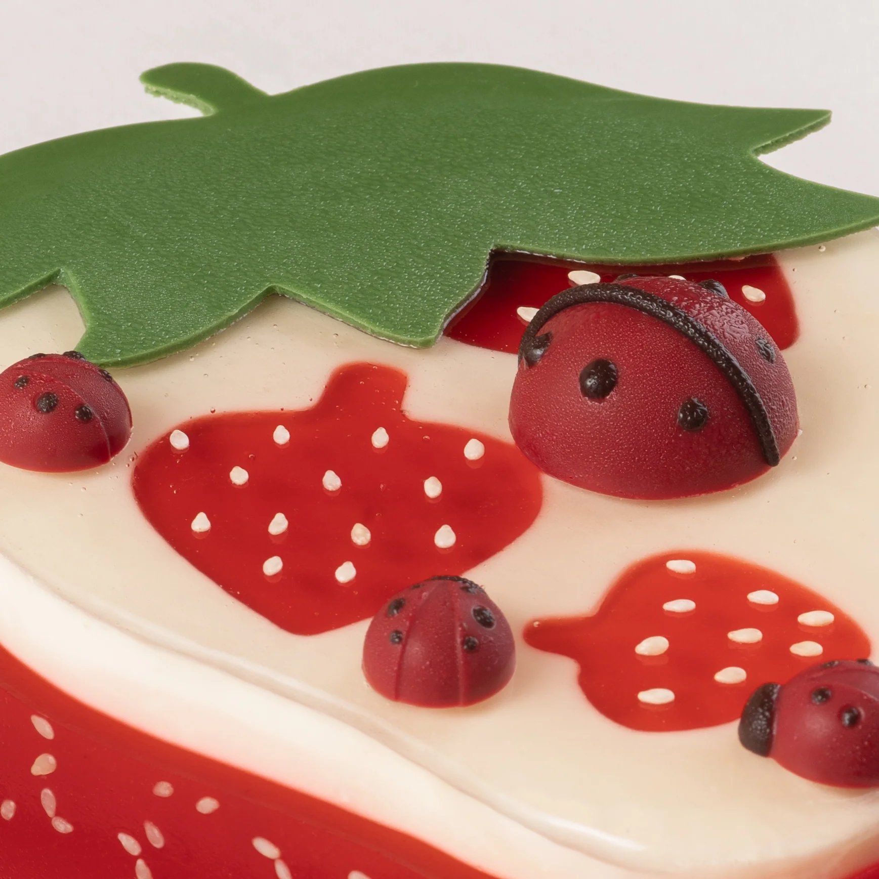 Top: strawberry-shaped salted plum tea jelly, ladybug bonbon filled with strawberry jam, chocolate leaf, chocolate ladybug.